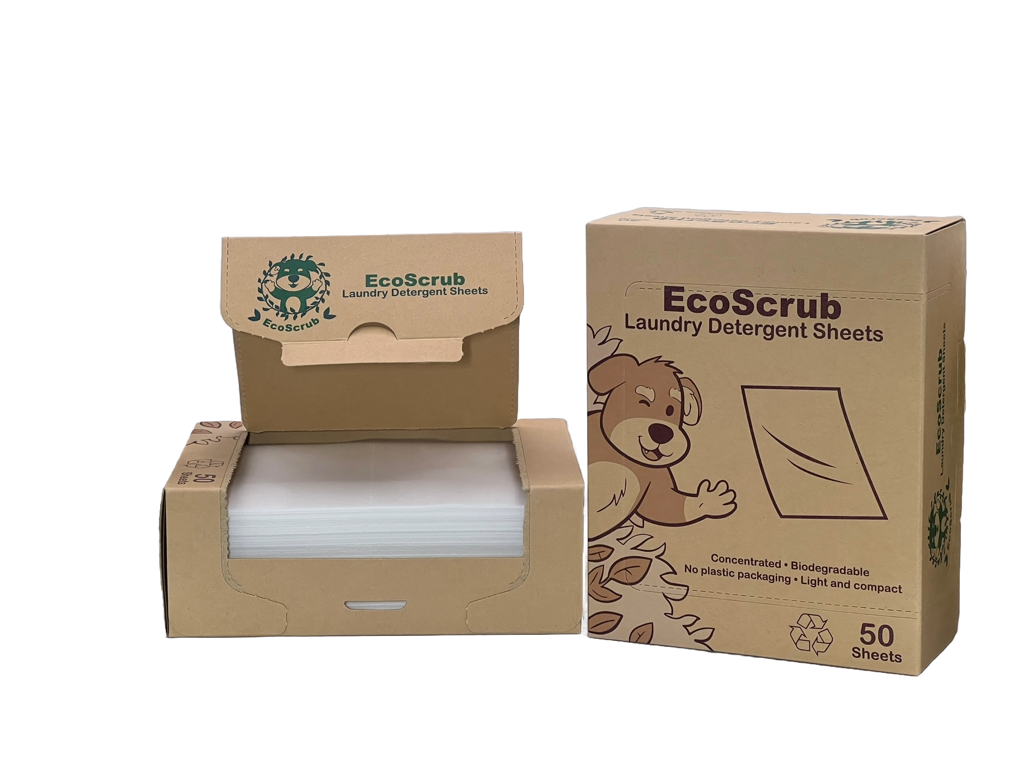 EcoScrub's premium concentrated detergent sheets are crafted with plant-derived surfactants, solvents, and water softeners for effective cleaning without harsh chemicals while minimizing environmental impact.